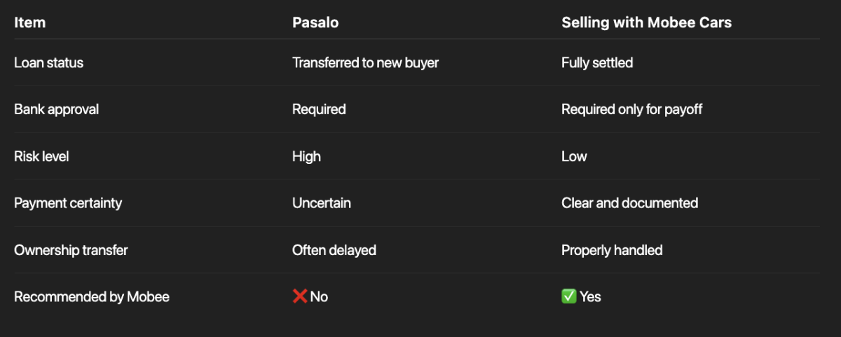 To protect sellers, buyers, and dealers, Mobee does not transact pasalo or assume-balance deals.